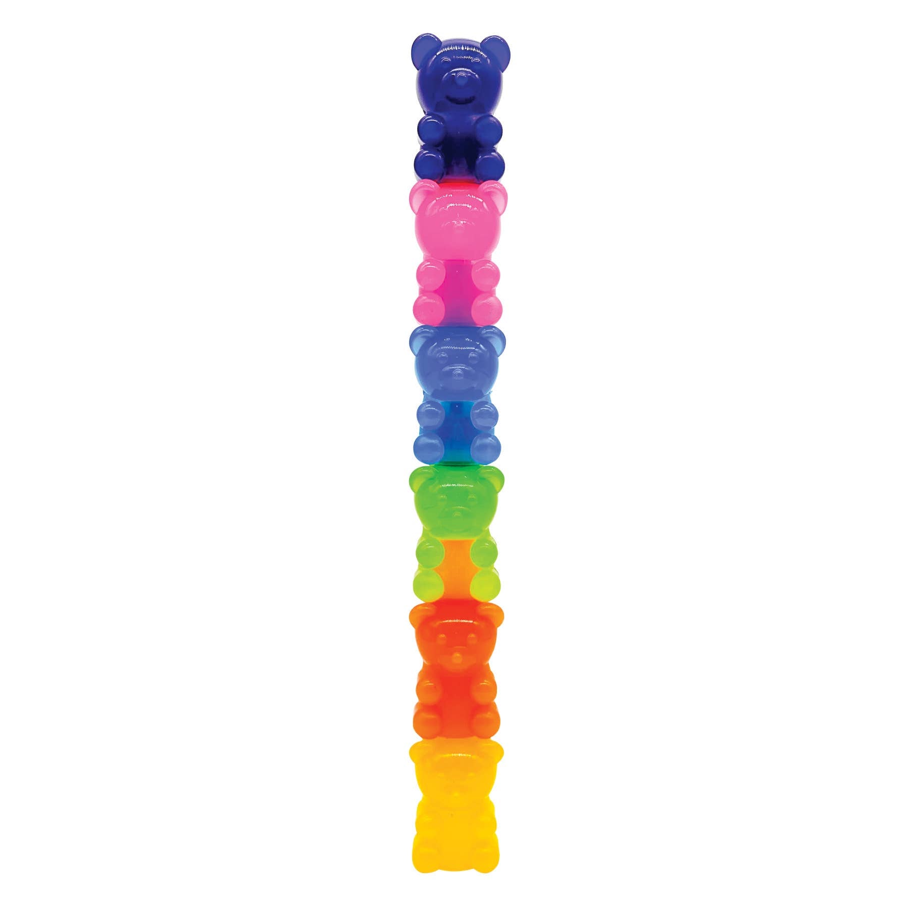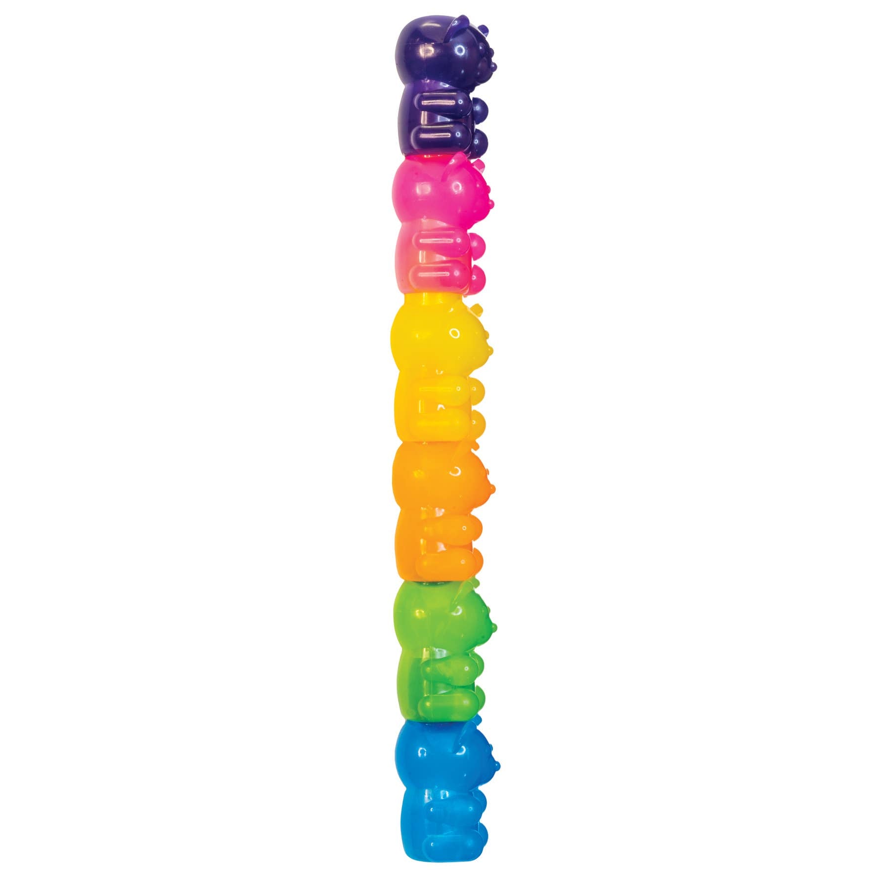 Stack ‘em high, stack ‘em low, stack ‘em for on the go! Stackable and BEARy cute highlighters! Gummy bear shaped highlighters come in 5 ink colors (pink, yellow, green and blue) plus a purple cap. Ink matches bear color. Fun to arrange in your own color order. Chisel-tip. Warning - Choking Hazard - Small Parts. Highlighters are 2.5” tall; cap is 1.5” tall; 9” tall when stacked together.