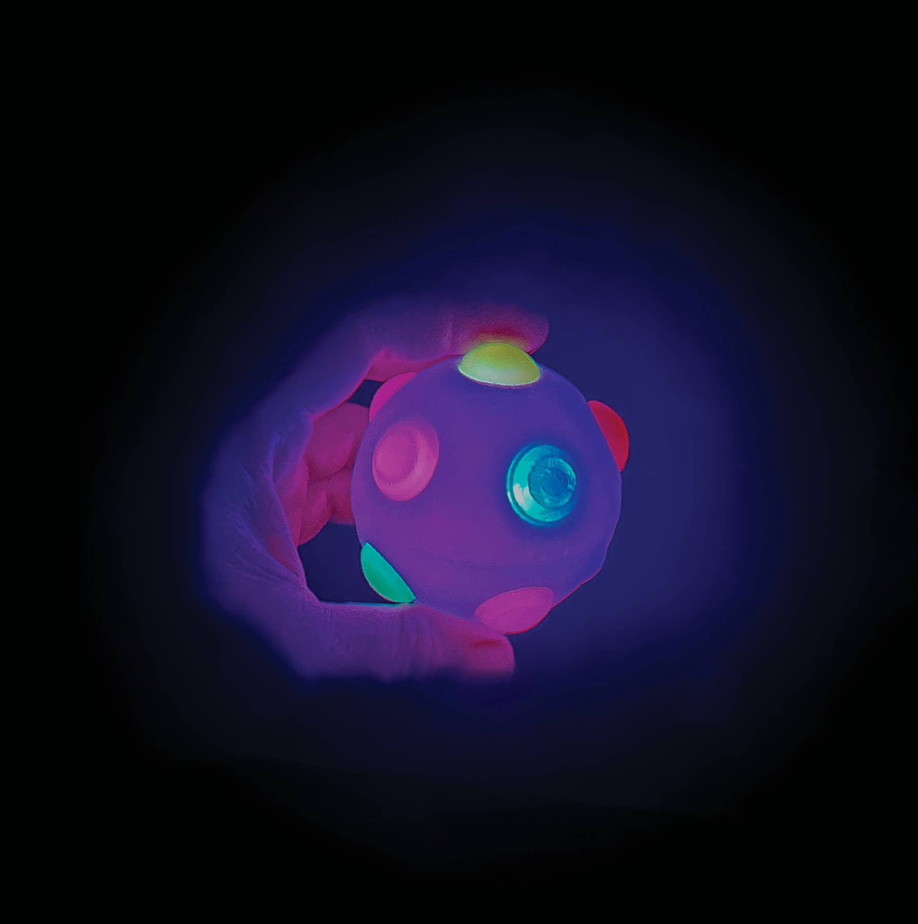What’s white, covered in colorful bumps and flashes when tapped? This ball! Fun-sized ball flashes multi-color lights when tapped. Warning - Choking Hazard - Small Parts. Approx. 3” in diameter.